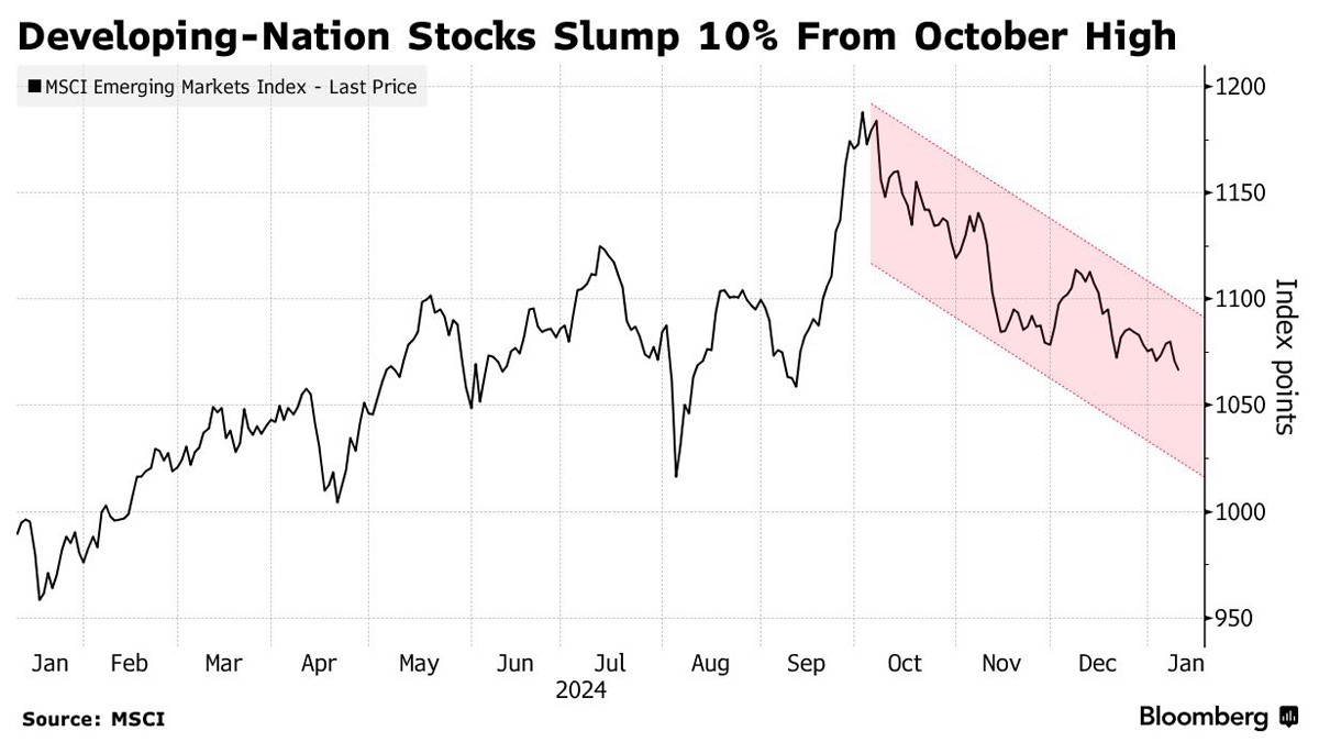 Emerging-market equities and currencies have experienced significant volatility, with the MSCI EM stock index entering correction territory after a 10% decline from its October peak. Key drivers include U.S. policy uncertainty, China's muted economic growth, and global inflation dynamics. The index, heavily weighted by Chinese equities, has been impacted by disappointing stimulus measures and persistently weak economic indicators. Chinese tech stocks are poised for their largest weekly drop in nearly two months. Broader sentiment remains fragile amid concerns over low inflation and sluggish growth in the world’s second-largest economy. Semiconductor giants Samsung Electronics and Taiwan Semiconductor Manufacturing Co. were leading decliners due to anticipated U.S. restrictions on global semiconductor trade under the last days of the Biden administration. Meanwhile, developing currencies weakened as the U.S. dollar strengthened, with the Chilean peso, Mexican peso, and South African rand among the hardest hit. Global inflation concerns persist, despite the Federal Reserve's monetary easing path, leading to market recalibrations for future interest rate cuts. This, coupled with rising U.S. Treasury yields and policy ambiguity ahead of Donald Trump’s inauguration, has further dampened risk appetite. Analysts anticipate market turbulence in response to Trump’s proposed tariffs and unpredictable commentary. Brazilian and South Korean equities added to the drag on the MSCI index, influenced by fiscal issues in Brazil and South Korea’s political instability. Investors are cautious but optimistic about undervalued opportunities emerging once policy clarity improves.