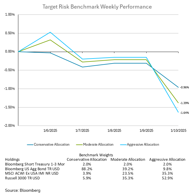 With equities and bonds selling off in tandem, investors across all risk tolerances experienced losses last week. The aggressive target risk benchmark fared the worst as the equity decline was the most pronounced across asset classes, dropping by -1.64% for the week. The moderate target risk benchmark did not hold up much better with a decline of -1.39%. Conservative investors were not spared due to the spike in bond yields, ending the week with a loss of -0.96%.