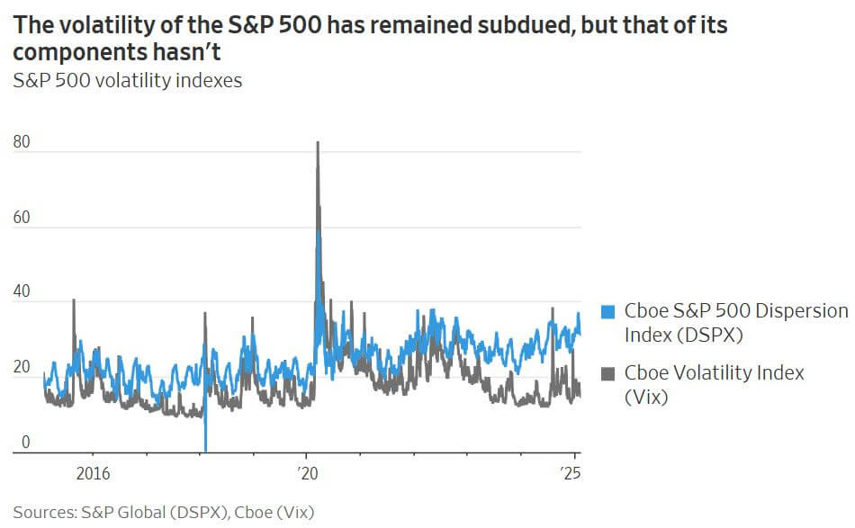 The current stock market presents a paradox: while the S&P 500 has shown relative stability, individual stocks within the index have experienced significant volatility. Year-to-date, the S&P 500 has risen modestly despite disruptions from China’s advancements in artificial intelligence and the Trump administration’s tariff policies. The Cboe Volatility Index (Vix)—the market’s “fear gauge”—has remained below its historical average of 19.5, indicating muted overall investor anxiety.However, beneath this surface stability lies pronounced dispersion—the divergence in individual stock movements. The Cboe S&P 500 Dispersion Index, which measures the degree to which individual stocks deviate from the broader index, has reached its highest level since May 2022. One factor contributing to this phenomenon is the differentiated impact of AI developments. Unlike previous periods when AI enthusiasm uniformly lifted related stocks, the current wave of Chinese AI models poses varying risks and opportunities for different companies. For instance, since China’s DeepSeek AI announcement on January 24, Alphabet’s share price has dropped while Meta Platforms has risen. Similar divergence is evident in companies sensitive to protectionist policies, such as Caterpillar, Hasbro, and Dollar General. Investor behavior may also be amplifying dispersion. Hedge funds increasingly use options to bet on low index volatility while profiting from high individual stock volatility. According to Cboe data, this strategy yielded a 28% return in 2024—outperforming the S&P 500. However, these trades can reinforce volatility by compelling banks, which take the opposite side of these bets, to adjust their equity holdings accordingly. Additionally, the rise of short-term options trading among retail investors and derivative-based ETFs may further distort market signals. Historically, periods of high dispersion often precede broader market volatility, as correlations tend to increase during downturns. Given elevated equity valuations, investors should consider holding bonds and cash as a hedge against potential market disruptions.