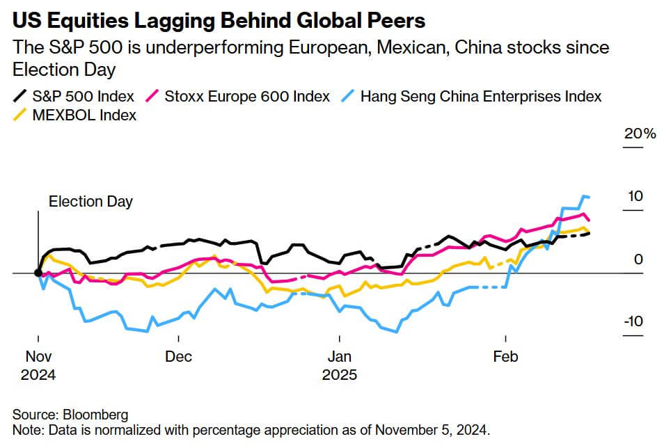 One month into President Donald Trump’s second term, the momentum behind many trades that were initially popular following his re-election has waned. Investors who had anticipated robust growth driven by deregulation, tax cuts, and tariffs are now recalibrating expectations across equities, currencies, and cryptocurrencies. US equities, particularly the S&P 500, have lagged behind global peers like European, Chinese, and Mexican markets. Small-cap stocks, which initially surged due to their domestic focus and expected insulation from trade wars, have since faltered. The Russell 2000 Index spiked 5.8% the day after the election but now sits only about 1% above its November 5 close. Elevated interest rates have disproportionately affected small and mid-sized firms due to their higher debt burdens. Energy stocks, despite an early post-election rally, have returned to pre-election levels, while financial stocks have performed better, with the S&P 500 Financials Index up 12%, largely driven by solid bank earnings. The US dollar, once a primary beneficiary of the Trump trade, has also lost momentum. After rising 4.5% from Election Day through mid-January, the Bloomberg Dollar Spot Index has since declined by 1.5%. Traders had overestimated the inflationary impact of tariffs and their subsequent effect on bond yields. This miscalculation, combined with the Treasury’s decision to maintain steady bond issuance and reduce deficit concerns, has also led to a flattening of the yield curve between two- and 10-year Treasury notes, reversing its sharp post-election steepening. In the cryptocurrency sector, post-election gains have moderated. Bitcoin surged around 50% in the two months following Trump’s victory, fueled by expectations of a more favorable regulatory environment. However, after peaking above $100,000 in January, it has since fallen below $97,000. The administration’s delay in implementing policies like a national Bitcoin reserve and scandals involving meme coins have dampened market enthusiasm.Overall, the initial optimism surrounding Trump’s second term has been tempered by the complex realities of trade policies, interest rates, and delayed regulatory reforms, leading to more cautious investor sentiment across asset classes.
