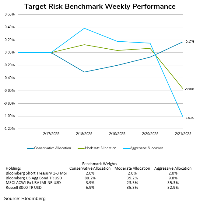 The sudden shift in sentiment resulted in weekly losses for aggressive and balanced investors. Domestic equities sold off significantly, while international stocks were flat for the week. However, bonds thankfully acted as a counterweight as investors sought out safety, helping to offset equity losses. The aggressive target risk benchmark finished the week down -1.03% after the sharp selloff on Friday. The moderate target risk benchmark saw a smaller decline of -0.58% for the week. In contrast declining bond yields benefited the conservative target risk benchmark, which finished the week with a gain of 0.17%.