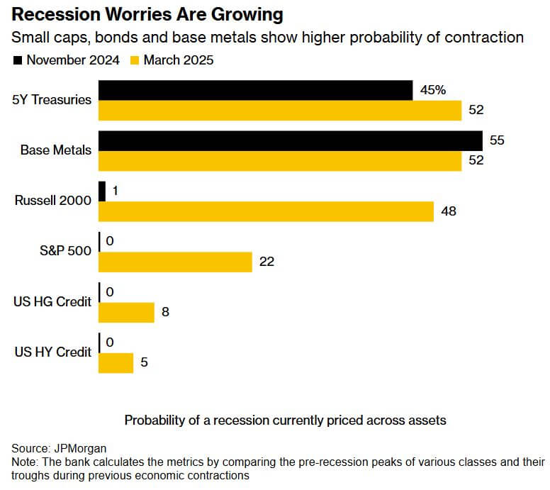 Financial markets are increasingly signaling recession risks due to tariff uncertainty and signs of economic weakness. JPMorgan Chase estimates a 31% probability of a downturn, up from 17% in November, while Goldman Sachs raises its estimate to 23% from 14%. Indicators like five-year Treasuries and base metals suggest an even higher risk of contraction. Market volatility has risen as investors react to President Trump’s tariff policies, which have dampened business and consumer confidence. Economic data shows U.S. factory activity near stagnation, declining consumer confidence, and weaker personal spending and housing reports. Despite recession concerns, some economic strengths remain, such as low unemployment and resilient income metrics. Analysts caution against overinterpreting weak survey-based data, though economic growth appears more reliant on fewer key drivers. While stagflation fears grow, the overall outlook remains uncertain.