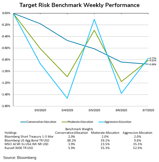 This difficult market environment resulted in losses for the week for investors of all risk tolerances. The high equity volatility saw aggressive and moderate portfolios whipsawing violently from day to day but trimming losses to end the week. Despite the recovery on Friday, the aggressive target risk benchmark ended with a loss of -0.77% for the week, while the moderate target risk benchmark ended the week down -0.81%. Bonds yields rose for the week as well, leading the conservative target risk benchmark to also end the week with a substantial loss of -0.88%.