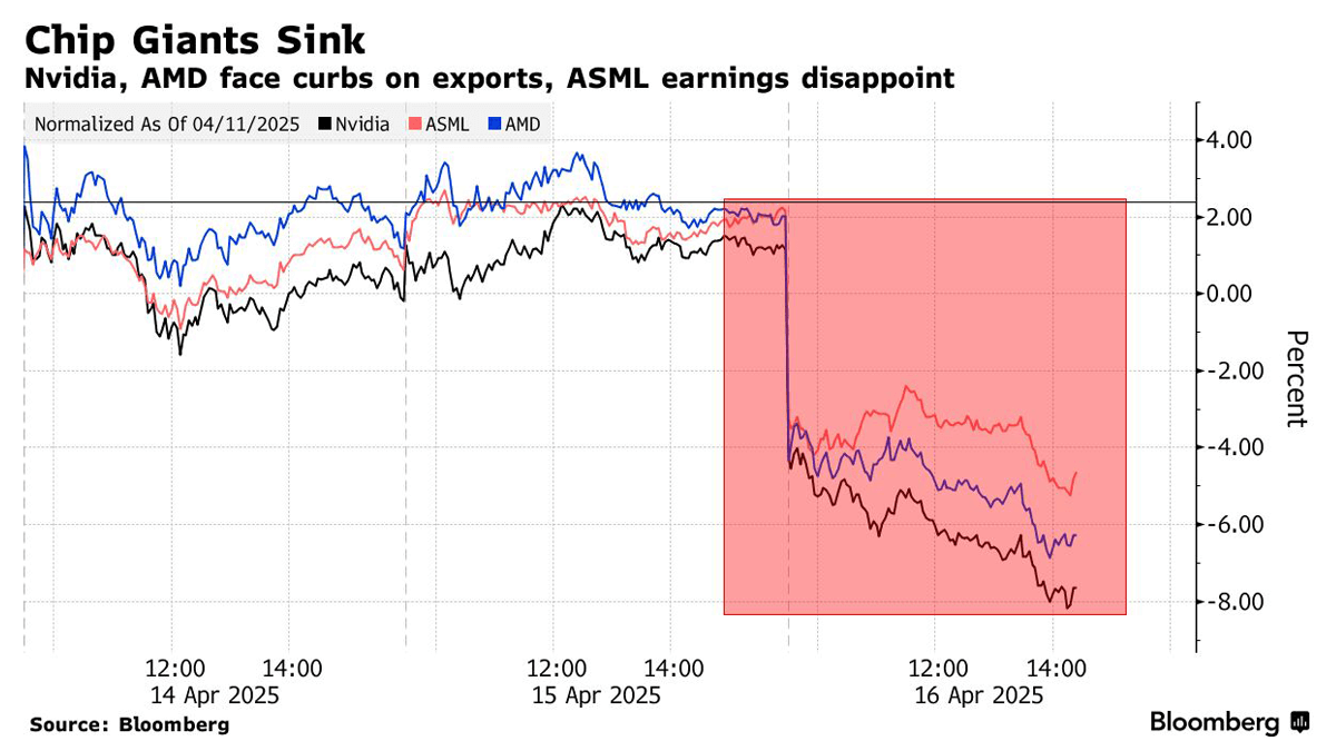 Technology stocks declined sharply Wednesday as new U.S. export restrictions on advanced semiconductor sales to China rattled markets. Nvidia and AMD led losses, with Nvidia projecting a $5.5 billion charge due to the licensing requirement on its H20 AI chips, and AMD anticipating up to $800 million in related costs. ASML Holding also fell after missing order forecasts, while the broader Philadelphia Semiconductor Index dropped 3.72%. The U.S. mandate, which now requires a license to sell chips such as Nvidia’s H20 and AMD’s MI308 to China and select countries, represents a significant escalation in U.S.-China tech tensions. While the H20 chip was engineered to comply with prior export restrictions and features significantly reduced performance—about 75% below Nvidia’s top-tier H100—it remained in high demand, particularly in China. The new policy renders even this compliance-driven approach ineffective, underscoring the growing unpredictability of regulatory barriers. Although the H20 chip contributes a modest portion of Nvidia’s expected $182 billion in data-center revenue for the fiscal year, the sudden loss of access to the Chinese market undermines Nvidia’s ability to meet aggressive growth expectations. Investors had anticipated a 56% year-over-year revenue surge, now thrown into question. The restrictions came just one day after Nvidia announced a $500 billion investment to build AI supercomputers in the U.S.—a move widely viewed as an effort to align with the Trump administration’s push for domestic manufacturing. Despite such efforts, CEO Jensen Huang’s high-profile engagement with President Trump appears insufficient to shield the company from the broader trade policy fallout. Ultimately, Nvidia's situation illustrates the vulnerability of even industry leaders to geopolitical risk. The company’s dominance in AI is now challenged not by competitors, but by policy decisions that reshape global technology supply chains.
