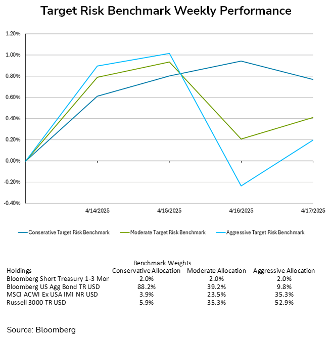 Last week saw conservative investors fare better than moderate and aggressive investors. The bond market calmed with yields declining for most of the week, resulting in the conservative target risk benchmark finishing the week with a gain of 0.77%. The moderate target risk benchmark finished with a small gain of 0.41% thanks to a rally in international stocks, while the aggressive target risk benchmark finished in last with a small gain of 0.2% for the week.