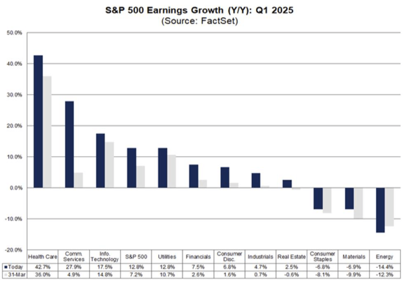 The Q1 2025 S&P 500 earnings season reveals a nuanced corporate backdrop marked by robust performance and growing caution. Companies have exceeded expectations with a 12.5% year-over-year EPS increase—up from a pre-season forecast of 6.6%—driven by strength in sectors like Health Care, Communication Services, Information Technology, and Financials. This is the second consecutive quarter of double-digit earnings gains and the seventh straight quarter of annual growth. Revenue trends, while positive, are more subdued. Only 62% of firms exceeded revenue expectations, and revenue growth stands at 4.8%, the 18th consecutive quarter of gains. Notably, the Industrials sector was the lone revenue decliner.