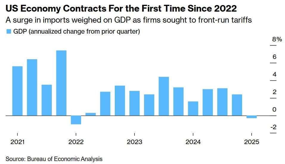 The U.S. economy contracted by 0.3% in Q1 2025, its first decline since 2022, driven by an unprecedented front-loading of imports ahead of new tariffs, which slashed nearly five percentage points from GDP via net exports—the sharpest drag on record. Despite this contraction, underlying domestic demand remained firm: consumer spending rose 1.8%, and business investment in equipment surged 22.5%, the fastest pace since 2020. Final sales to private purchasers, a core measure of domestic strength, climbed 3%. Inflation trends were favorable, with the core PCE index flat month-over-month in March for the first time in nearly five years.