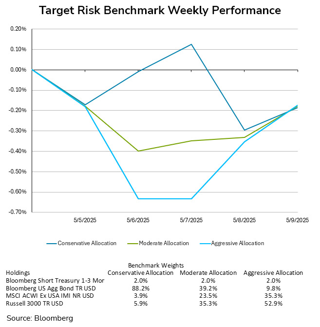 The sideways churn in markets for the week saw investors largely flat for the period across risk tolerances. After drifting downward to start the week, equities recovered ground, resulting in the aggressive target risk benchmark ending with a small loss of -0.17%. The moderate target risk benchmark finished in the same territory as well with a loss of -0.18%. The conservative target risk benchmark briefly saw a slight gain earlier in the week, but fell to end the week, with a similar weekly loss of -0.19%.